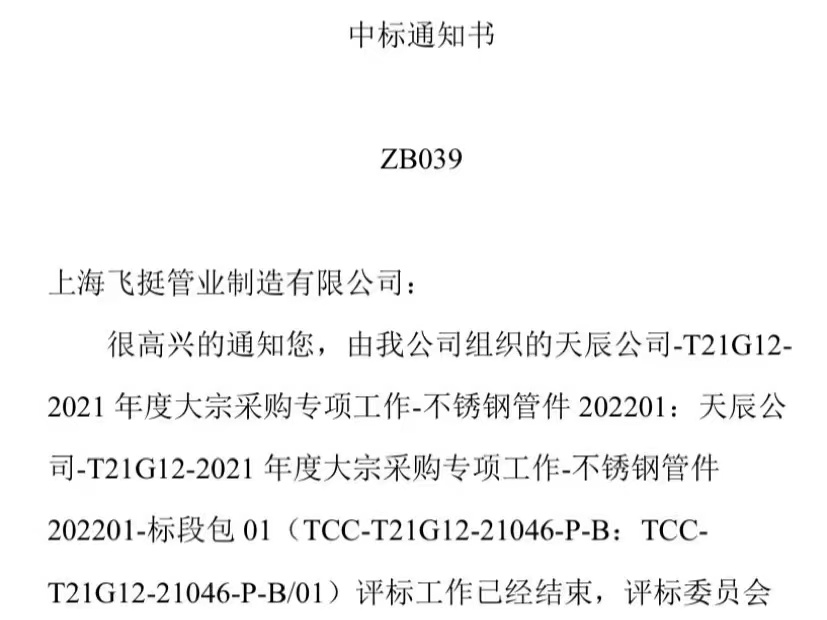 近日,我司成功中标天辰公司-T21G12-2021年度大宗采购专项工作-不锈钢管件202201-标段...