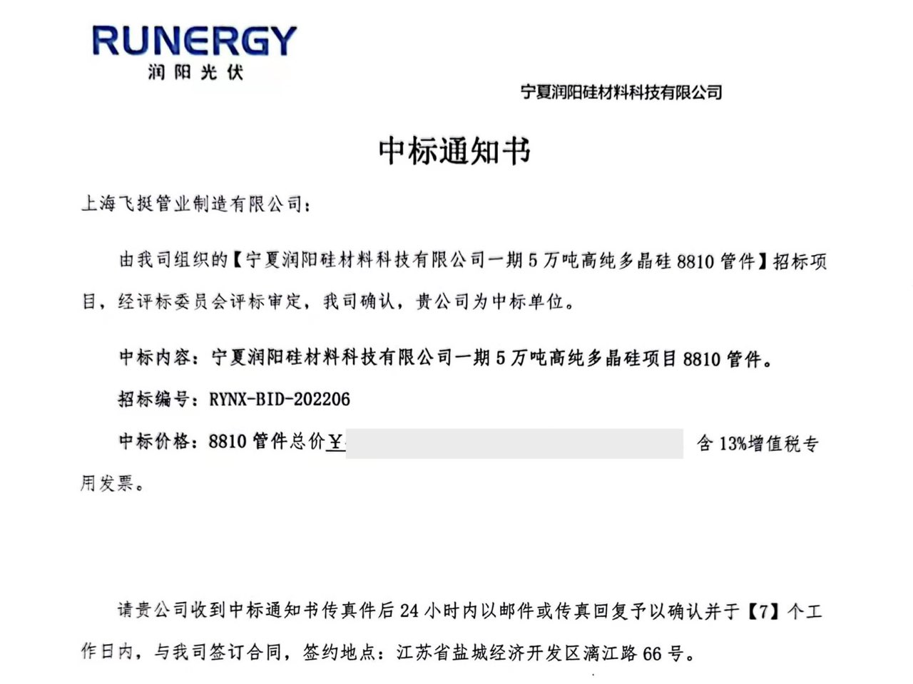 3月31日,我司成功中标宁夏润阳硅材料科技有限公司一期5万吨高纯多晶硅项目N08810管件标段。该项...